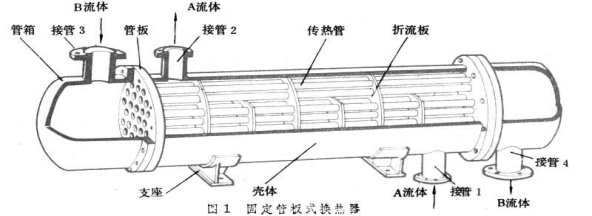 接管2流出。B流體從接管3流入,通過(guò)管內(nèi)從接管4流出。如果A流體的溫度高于B流體,熱量便通過(guò)管壁由A流體傳遞給B流體;反之,則通過(guò)管壁由B流體傳遞給A流體。殼體以?xún)?nèi)、管子和管箱以外的區(qū)域稱(chēng)為殼程,通過(guò)殼程的流體稱(chēng)為殼程流體 (A流體)。管子和管箱以?xún)?nèi)的區(qū)域稱(chēng)為管程,通過(guò)管程的流體稱(chēng)為管程流體(B流體)。